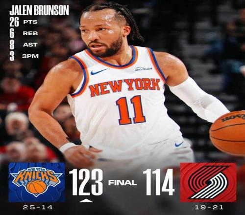杨瀚森未出场 尼克斯终结开拓者5连胜
